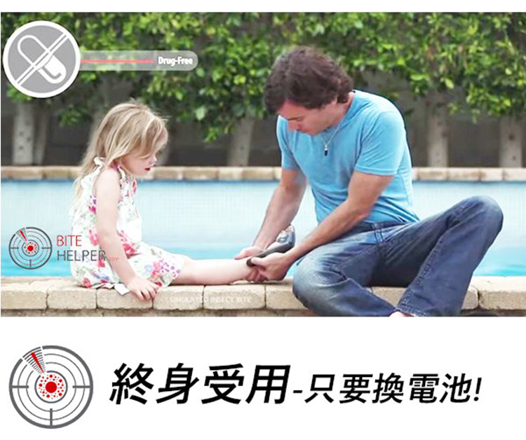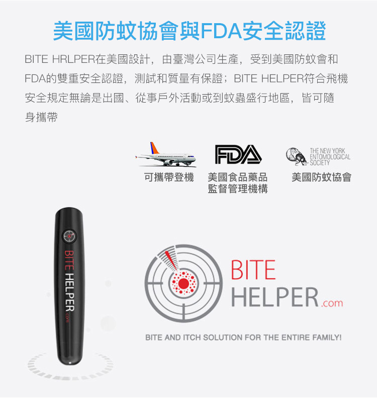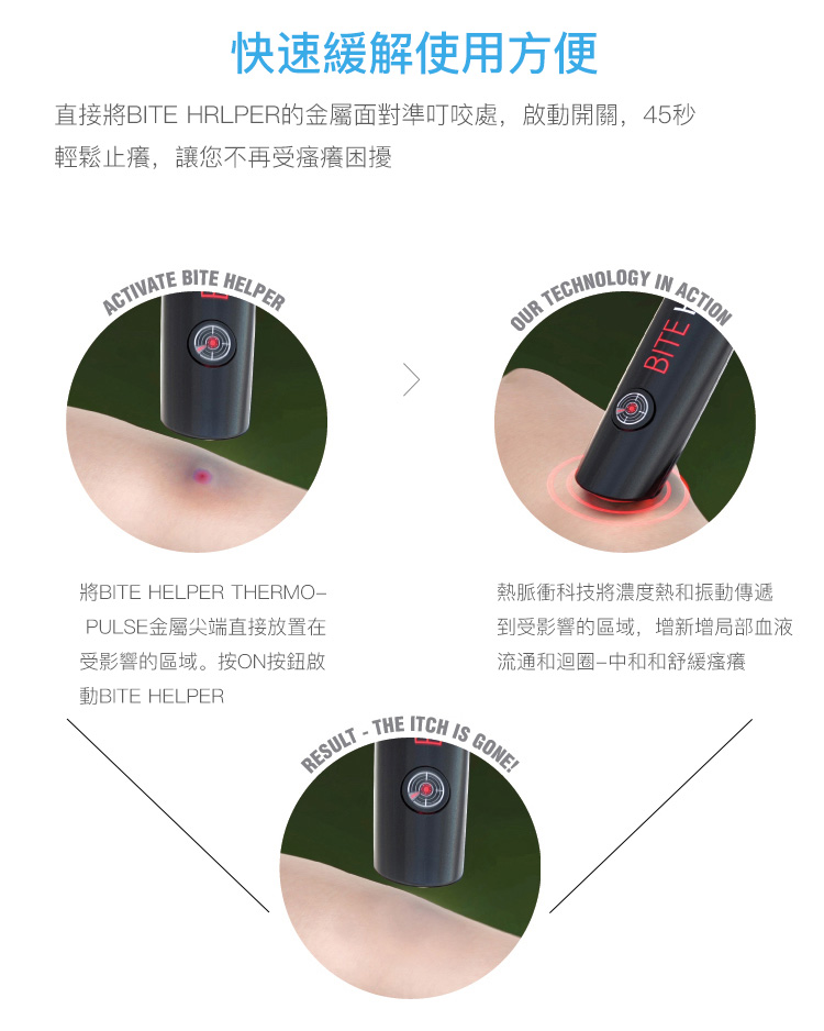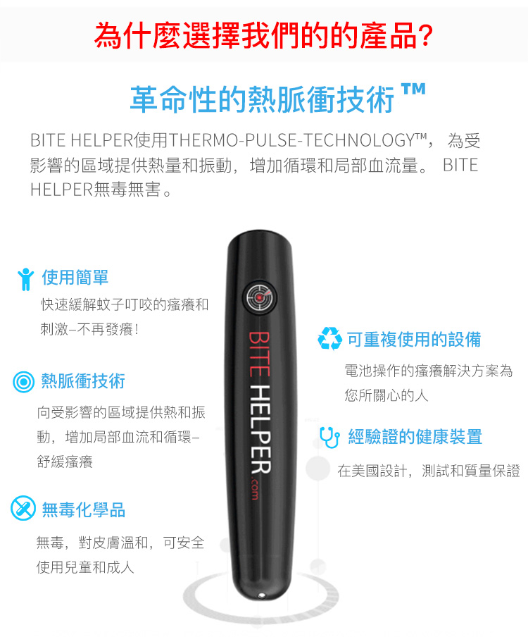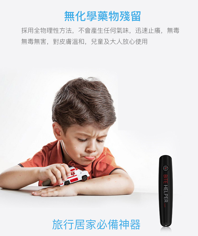30秒之內解決蚊叮帶來的痕癢,快速安全,携带方便!熱脈沖技術,安全無化學殘留!全家一起使用!美國蚊蟲叮咬止癢筆在美團設計,由臺灣公司生產,受到美團防蚊會和FDA的雙重安全認證,測試和質量有保柳丁,符合飛機安全規定無論是出國、從事戶外活勤或到蚊蟲盛行地區,皆可隨身攜帶,探用全物理性方法,無添加任何化學物質或藥物,不會產生任何氧昧,迅速止癢,無毒對皮膚溫和,安全無害適用於4歲及以上的小孩和成人。